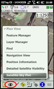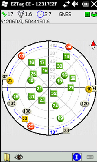 The Satellite Sky Plot is available through EZTag CE View menu. The sky plot is based on the latest GNSS almanac available in the receiver. It displays a graphical view of the position of the GNSS satellites in the sky.